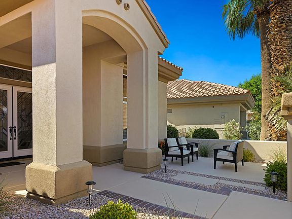 Sun City Palm Desert.UNIQUE and SPECTACULAR LOCATION! This impressive Marquis Estate model home is just minutes from the main clubhouse. Completely remodeled, it offers stunning views of the Santa Rosa Golf Course's 12th hole and green, as well as the lake and beautiful sunrises from the front courtyard. The back patio overlooks the 13th tee box and fairway, San Jacinto Mountains, and breathtaking sunsets. The home boasts high-quality upgrades/features, including newly installed double glass entry doors, 14-foot coffered ceilings, Hunter Douglas silhouette shades on all large windows, modern light fixtures, and LED lighting throughout. Both the interior and exterior have been painted, with new 16'' tile floors and baseboards installed. Additionally, the home features a craft room/office area with custom cabinetry and space for a Murphy bed for extra guests. The family room includes beautiful custom cabinetry with ample storage. The kitchen stands out with a newer Frigidaire Gallery refrigerator, GE Profile stainless steel 5-burner range, GE Profile dishwasher, microwave oven, plenty of storage space, and quartz countertops with glass tile backsplash. The primary bedroom and bath have a double-door entry, a new soaking tub, quartz countertops, custom-made mirrors, and a custom walk-in closet with abundant drawers and shelving. The secondary bedroom also has its own remodeled bath area with new floor tiles, fixtures, quartz countertops, and a custom-made mirror. The powder