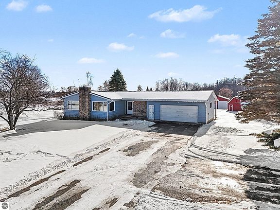 Serene, peaceful 5 acre homestead (with 3 charming outbuildings) offers picturesque country living, while close to a quaint town. This well maintained ranch style home includes an attached garage, paved driveway, open floor plan, main floor laundry, and central air. Modern updates, with original charm, include: NEW METAL ROOF, light fixtures, electric panel, and fresh paint. Multiple spaces for entertaining and recreation in the partially finished basement with a 2nd kitchen & 2nd fireplace, additional Family Room, large Living Room, covered back porch with privacy, and plenty of outdoor space. Large pole barn, hay barn, and additional shed have plenty of space for a hobby farm, hobbies, projects, and all the toys needed for our Northern Michigan Playground - with a wooded hunting spot on the property. A rare opportunity, move in ready, and at an affordable price - this is a MUST SEE! MOTIVATED SELLERS!