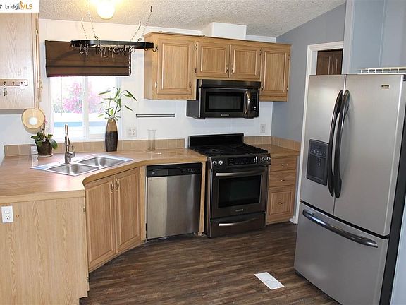 Beautiful move-in ready single wide in friendly family park. Many updates. Stainless appliances and sink. Walk in closets both bedrooms. Very good separation of space. Light and bright. Washer/dryer and storage in laundry room. Excellent indoor outdoor flow to covered brick patio with sink, cabinets and overhead fan. Great for entertaining. Outside storage sheds. Easy commute location. Very well managed park.