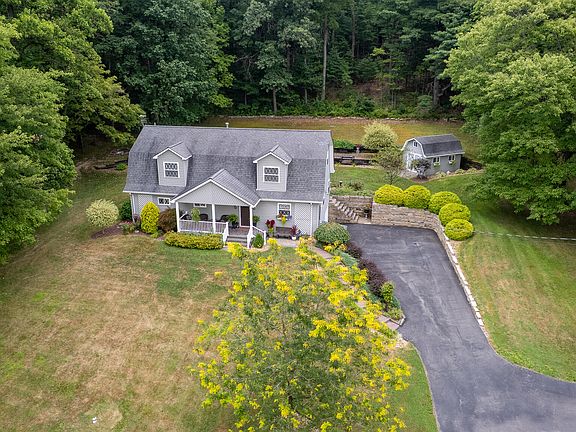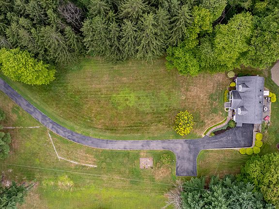 Fire-pit surround by woodsPaved drivewayRear patioFormal dining roomExtra guest bath