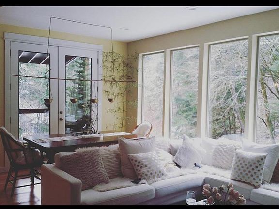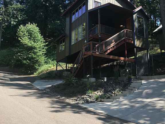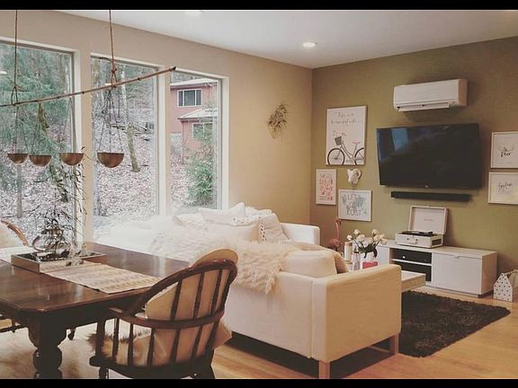 Contemporary custom treehouse style home nestled amongst the trees in the very desirable South hills neighborhood of Eugene. This modern 2 bed, 2 bath, 1600sqft + home is situated at the end of a cul de sac on a quiet street. Completed in 2015 it boasts open concept living, dining and kitchen with bamboo flooring, modern appliances, floor to ceiling windows and French doors to a covered balcony with west facing sunset views. 2nd floor large master suite has vaulted ceilings, duel wall windows with stunning views, oversized barn door entry to master en-suite and bonus room. Amenities include, washer dryer, carport parking, storage shed, landscaping and natural spring fed fish pond. Truly a one of a kind home! Cats considered. Available for viewings now, and move in ready November 20th No smoking. Landscaping included. Cats allowed