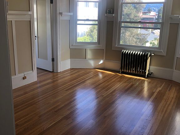 This beautiful 2 bedroom flat is located on the top floor of a 12 unit Edwardian style building on a tree lined street, walking distance to shops, restaurants and Lake Merritt. Newly refinished Hardwood floors run throughout this spacious light and airy home with giant double pained bay windows. This home has both a an enormous living room and formal dining room, a country kitchen with tons of built in cabinetry, and gas stove and 2 large walk in closets. The 1 bathroom has a pedestal sink and shower over tub. Lovely shared garden in the back. Laundry facilities on 1st and second floor of the building. This is a strictly adhered to no smoking and no pets building. Garage $225 extra. Security is 1x the monthly rent 1 year lease then goes month to month. Owner pays water heat and garbage