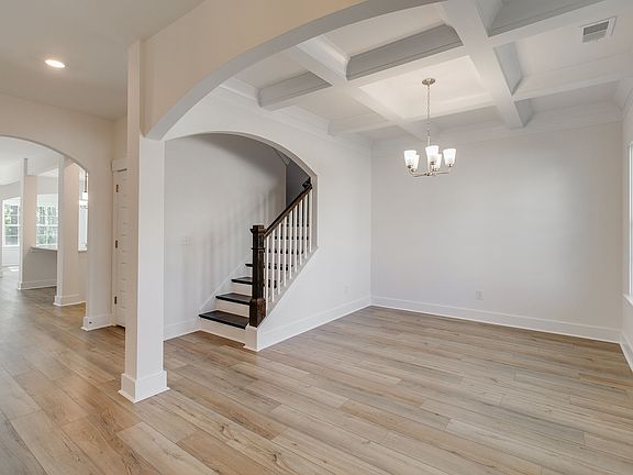 This stunning Victor floor plan is located on one of the last remaining lake-front lots in Woodleigh Park! Equipped with a dock permit in the established Lake Carolina community, this five-bedroom, two-and-one-half-bathroom home has it all. From the front porch entry, a formal dining room with a coffered ceiling is situated to the right. Luxury vinyl plank flooring flows throughout the common areas of this home, leading to the gourmet kitchen that overlooks the great room with a gas fireplace. The kitchen features beautiful white cabinetry and white quartz countertops with a gourmet appliance layout. A sunroom has been added to the eat-in area for extra entertainment space. The laundry room and primary suite are also conveniently located on this level. Dual sinks, a sizable walk-in closet, and a glass shower are housed in the primary suite. With hardwood flooring on the staircase, four secondary bedrooms share a bonus room and bathroom with dual sinks on the second level. Make this home yours today at Woodleigh Park in Lake Carolina!