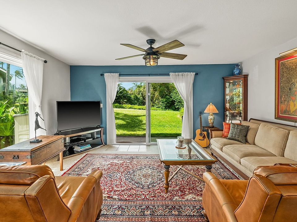 A completely renovated ground floor corner unit with a lot of open grassy area and privacy is now available. It feels like your own back yard .You can bring your dog. The corner units rarely become available . The trade winds blow right through the home. Kitchen, bathrooms, windows and much more have all been redone. The primary Bathroom has a rainfall shower panel with 6 body jets .There is a large lockable owners closet. Enjoy relaxing on the outdoor lanai with views of the jungle and distant mountain vistas. Private pool for everyone to enjoy. Just a 5 minute drive to the New One Hotel and the Princeville shopping center. The home was a full time vacation rental up to 2018, however now it is only part time as the current owners reside there more.