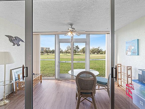 Beautiful Ground Floor Condo with Golf Course Views at The Links at Pinebrook. This is a well-maintained, structurally sound condo in a German-designed, hurricane-resistant building in Zone D so no evacuation required! No damage or leaks from past storms. New roof installed in summer 2023. Low association fees and sweeping views of the 6th Fairway make this home a standout. This spacious 2 bedroom, 2 bathroom unit offers 1,280 sq ft of comfortable living space. Enjoy open concept living and dining areas with durable vinyl plank life-time flooring, a large enclosed Florida sunroom overlooking the golf course, and a generously sized utility room with extra storage. The bright kitchen features upgraded appliances, abundant cabinets, ample counter space, a pass-through to the dining area and a lighted ceiling fan for added comfort. The master suite offers golf course views, a large walk-in closet, and an updated bathroom vanity. The private second bedroom and full guest bath provide great flexibility for family or guests. Additional highlights: Maintenance-free exterior, covered parking just steps from your front door, ground floor convenience so if elevator goes out, no problem! The Links at Pinebrook amenities include: Heated community pool and spa with shaded lounging area. Clubhouse with billiards, workshop with tools, and exercise facility. Tennis, pickleball, and shuffleboard courts. Outdoor grilling and entertaining areas. Public access to the Pinebrook Ironwood Golf Club (voted #1 in Bradenton) Centrally located with easy access to shopping, dining, banking, just about anything you would need and Sarasota/Bradenton International Airport. Just minutes to Anna Maria Island and some of Florida’s most beautiful beaches!