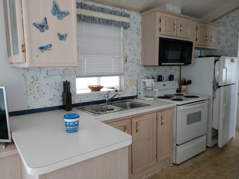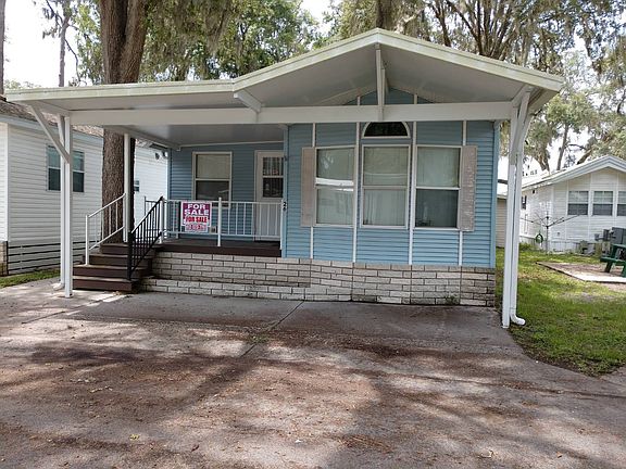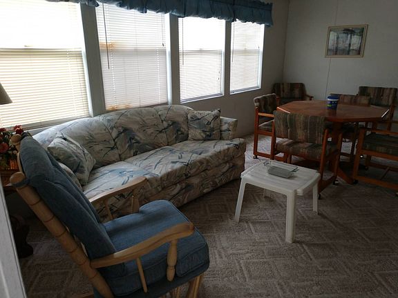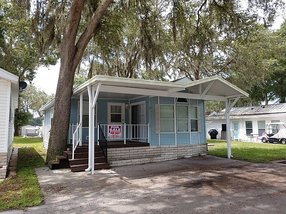 Located in an active 55+ community with plenty of activities to keep you busy. Close to restaurants, shopping and so much more. This is a great community to live in and enjoy Florida living. This is such a lovely home. Fully furnished and immaculate. A lovely covered porch makes it enjoyable to sit and have coffee or a nice libation with friends. Beautiful trees give for a wonderful breeze and shade. The Florida room is very comfortable and has a Pull out couch for guests, plus a nice dining set to enjoy a lovely dinner. Behind this great room is a full size laundry room with a washer and dryer plus a huge storage closet! Also, access to the back of the house. Entering into the main home, you have a great open floor plan with carpeted living space, full size kitchen and dining area. The kitchen also has lots of storage and a pantry with nice counter space. The dining area has plenty of windows and lovely decorative mirrors. Vaulted ceilings gives this home a very open and airy feeling along with all of the windows and large sliding doors. Bedroom is large and has built in dresser and drawers with a queen size bed and plenty of space. Full size bathroom as well. Lot rent includes lawn maintenance, water, sewer garbage and all park amenities for only $416 per month. This is a must see and priced to sell! She won't last long, call now for an appointment to see this lovely home. You won't be disappointed.