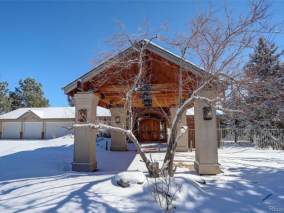 Welcome to Historic Jarre Creek Ranch - just four miles west of the quaint town of Sedalia. Breathtaking 9000+ sqft, private, secluded mountain contemporary residence on 35 acres with its own private 3-stall barn. Own a piece of Colorado history dating back to the 1870's; including a creek, riding trails, and water rights. Quality and value evident throughout. Enter the timeless mountain contemporary estate from a covered portico and into an amazing great room overlooking gorgeous acreage with deer, scrub oak, pine trees, a pond and a private 3-stall barn and 4-car garage. The property boasts 5 bedrooms, 7 baths, a home theatre, wet bar, and an office with a conference area featuring a separate entrance and a master bedroom with seating area, a private workout room and 5-piece bath with steam shower. One of the five fireplaces features the most amazing moss rock fireplaces ever built in a single family residence in Colorado. Exterior features covered patio, extensive decking, koi pond, fence back yard and gas grill. Perfect for entertaining. Everything about this unique, one-of-a-kind property is top notch: quality, location and lifestyle!