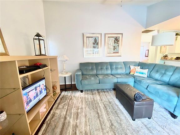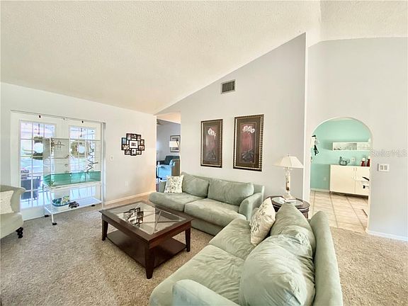 Charming exterior, with mature landscaping. As beautiful inside as out, this open concept pool home invites Florida living and entertaining at its best. The foyer entry leads to the open concept living/dining area which has vaulted ceilings with a sliding door looking through to the caged pool. The family room with high vaulted ceilings and sliding glass door to the pool is open to the kitchen. Kitchen and family room are divided by a large breakfast bar with a breakfast nook on the opposite side large enough to seat a family, plus a pantry. Bedrooms are split plan with the primary bedroom on one side boasting sliding doors to the pool, dressing area with walk in closet and separate sink. The bath area has a garden tub, shower and a second sink. Two bedrooms on the other side with guest bath in the center. There is a spacious interior laundry room leading to the garage. The garage has been converted with an additional room, could be used as a bedroom, office or work out room. There is also separate storage space that the exterior garage door opens into. The wall can be easily removed to return to a garage.