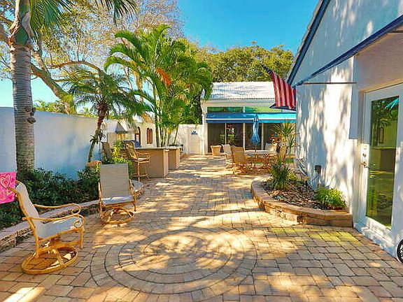 MUST CALL TINA FOR GATE ACCESS!! Dramatic price reduction. This amazing corner courtyard home with a pool in a beautiful, gated community. Full hurricane protection. Roof 2018, A/Cs 2018, garage freezer 2020. Walk thru the double door entrance, to be amazed by the secluded garden like setting with a granite summer kitchen and sparkling private pool. Main house has an updated kitchen, wall removed for a more open look. Upgraded appliances including a $7,000 Miele coffee center. Pull out shelves throughout the kitchen. Perfect sized primary suite. Bath has double sinks, separate tub/shower. Across the courtyard is a versatile guest house. 2 bedrooms (both have window, door and closet) and remodeled bath or 1 bedroom plus an office/den/living room. W/D in guest house. New awnings 2020