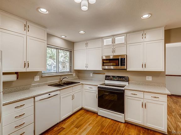 3 Bedroom, 3 Bath Home with 2 car attached garage, gorgeous hardwood floors, tile, and new carpet. Dining room features french doors that take you to a spacious deck, flagstone patio, and backyard. Kitchen features white cabinetry with soft close doors, built-in microwave, Bosch dishwasher with stainless interior, eating space overlooks large family room with high ceilings, gas log fireplace, and built-in bookcases. Powder bath and laundry is off the family room, as well as a large, almost 5 foot high, storage area below entire main level. Upstairs features 3 bedrooms, a full bath off the hallway, and a master bath with tiled shower and heated floor. The South East bedroom also has access to even more additional storage. Roof replaced 2014. All new gutters in 2017. House amenities include; Newer central air conditioning, whole house attic fan, and in-ground sprinkler system. Part of the Pinecrest Village community featuring a community park and sports field. Low HOA of $40/year pays for fun activities year round. Trash and Recycling collection is included by the City of Denver. Conveniently located with easy access to the mountains, downtown, extensive trail system, parks, restaurants, and shopping.