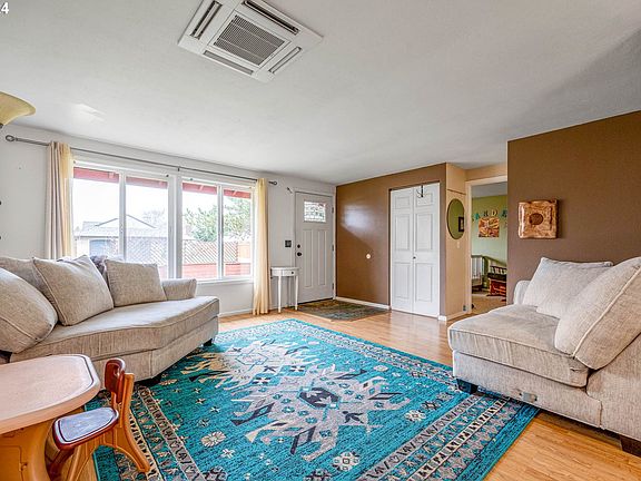 Welcome to this charming one-story ranch home in Eugene, OR that seamlessly blends warmth and functionality. This property features 3 bedrooms, 2 bathrooms, and conveniently has a living room, dining room, and family room with a wood burning fireplace. Step into the heart of the home, where the kitchen beckons you with freshly painted cabinets, and a new stainless steel sink. The primary bedroom is complete with its own bathroom and a walk-in shower. The patio, which is accessible through a sliding glass door in the family room, invites you to relax and enjoy the spacious backyard. The backyard features a river rock path bordered by stepable mint, and planter boxes filled with blueberries, rhubarb, and raspberries. The front yard is not short of its own charm with a planter box with grapes and a persimmon tree. The home additionally has a two car attached garage with room for the washer & dryer. The garage also has a 220 power outlet that caters to all your electrical needs. A large attic storage space above the garage adds practicality to this cozy abode, ensuring you have room for all your treasures. For all the outdoor enthusiasts, there's room for RV or boat parking on the side of the house. This home has been thoughtfully upgraded with a newer 30-year roof, a ductless heat pump for energy efficiency, a new attic storage ladder for easy access, a new stainless steel dishwasher, a new kitchen sink and water filtration system, and a new energy efficient hot water heater. Situated near Churchill High School in the Peppertree neighborhood, this home offers the perfect blend of convenience and community. Enjoy the peaceful ambiance while being close to local amenities and the vibrant energy of Eugene. Don't miss the opportunity to make this gem your own!