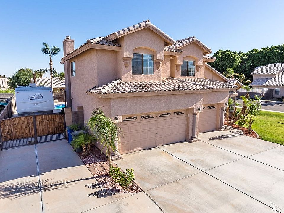 Welcome home! Corner lot, RV parking, double gates, Xtra cement, beautifully landscaped, pool with pop up valet & high privacy block wall. Meticulously maintained home with formal & informal living, kitchen has stainless steel appliances, granite, island, pantry. Ceramic tile & wood laminate flooring throughout, wide easy stairs & hall to master with double door entry, jetted tub, shower, walk in closet, double vanities. Family room w/ fireplace, French Doors to back yard oasis. Newer A/C & pool filter.