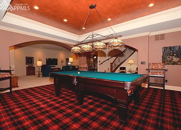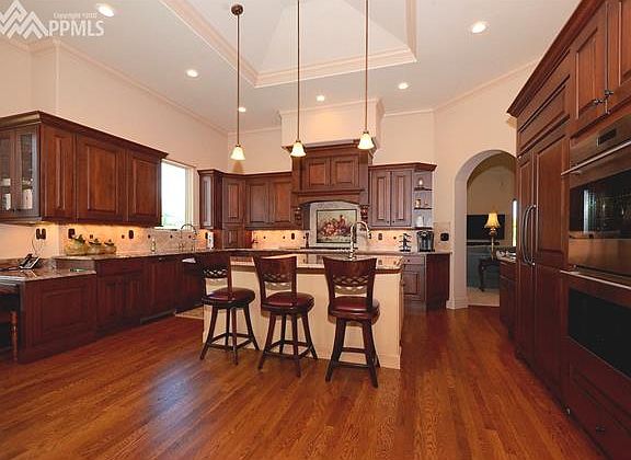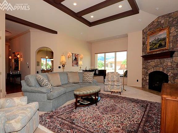 Wonderful Views of Pikes Peak from this Golf Course Residence in The Greens! This 4 bedroom + office, 5 bath custom home was completed in 2017. It offers custom finishes throughout plus 3-car garage and Pikes Peak views. Built with zero-step entries from the garage and main entrance as well as an elevator for accessibility and one-level living. The main level features beautiful hardwood floors, coffered / beamed ceilings and crown molding. Other features include living room with fireplace and walkout, formal dining room and gourmet kitchen. The gourmet kitchen includes an informal dining area, an island with counter seating, granite countertops and custom cabinetry. Also on the main level is the master suite with walk-in closet and private 5-piece bath, 2nd bedroom also with walk-in closet and private full bath and office with built-ins and fireplace. The elevator makes for easy access to the lower level which includes a large family room, recreation room, wet bar with counter seating, 2 bedrooms that share a Jack and Jill bath along with tons of storage in the unfinished space. Home is sited to offer Pikes Peak, Front Range and golf course views.