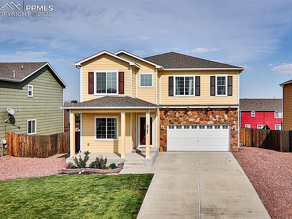 UPDATE: First floor newly painted!!! Beautiful two-story home with lots of space in Cuchares Ranch! This home provides an option for a formal dining room, but is spacious enough to have two dining room choices and three living room choices. The large open kitchen area has all black appliances and allows for lots of cabinet and counter space as well as a fine pantry. Walkout access to a nice sized deck great for entertaining. The main level living room has custom floating shelves ready for you to use beneath your television on the wall. The main floor is completed with a half bath for any guests and visitors to use. Upstairs you will find a very spacious loft where you can watch the sunrise over the tops of other houses. The master suite has a large walk in closet and attached bath with double vanities, a soaking tub, standing shower, separate toilet room, and a linen closet. Three additional nice sized bedrooms, a full bathroom and laundry room complete the upper level. Enjoy outstanding mountain views from the master bedroom and other bedroom on the upper level. Downstairs in the basement, you have another large living room great for entertaining and walkout access to the backyard and storage shed. This home is close to all the military installations - 15 minutes from Fort Carson Gate 20, 17 minutes to Gate 4 (B Street), 6 minutes to Peterson SFB East Gate, and 17 minutes to Shriever SFB. This home is ready for you to call it home.