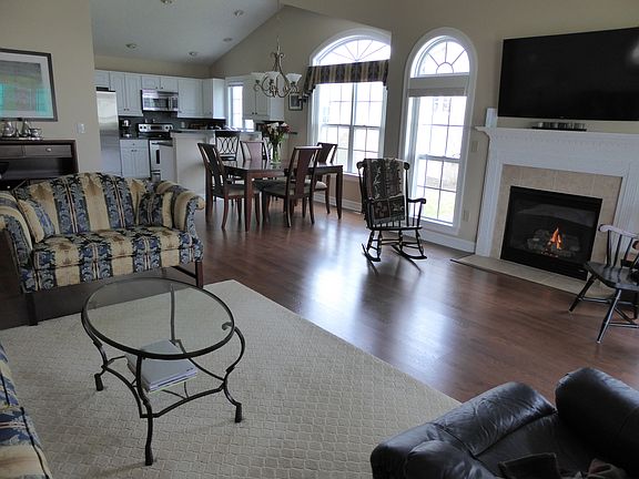 Carefree, one-level living in an immaculate patio home. Bright, open floor plan w/ cathedral ceilings, 2 bedrooms, 2 full baths, all-season sun room, finished basement, 2 car garage, and front porch. New flooring in living areas and bedrooms, freshly painted walls w/ neutral colors throughout, gas fireplace, and tons of storage space. HOA takes care of grass, snow, and external maintenance. Safe, friendly neighborhood, convenient to shopping and major highways.