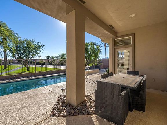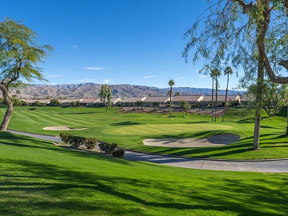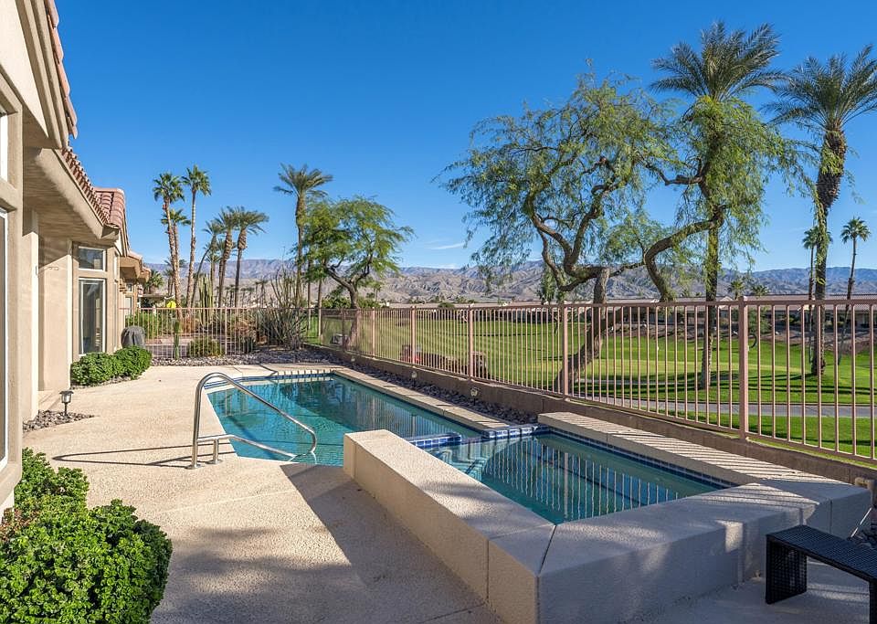 Sun City Palm Desert - Baccarat. Located a short distance to the Mountain View Clubhouse, this updated home sits elevated over the 17th green of the Santa Rosa course. The east facing rear yard features a beautiful pool and spa, spacious patio with multiple sitting area and panoramic golf course and mountain views. An updated paint scheme, gated courtyard with patio and dual doors with inset glass provide curb appeal. Inside, the foyer has a dramatic 12ft coffered ceiling. Tile and vinyl plank flooring are throughout. 10ft ceilings, transom windows, rounded hall entry ways and art niches provide an elegant and inviting environment. Upgraded light fixtures, fans and door hardware is throughout. The updated kitchen features quartz counters, stainless appliances, cabinets with pullout shelves and a breakfast bar. The family room features a quartz trimmed gas fireplace. The primary suite has a bay window providing views of the pool and golf course, and a huge walk-in closet. The primary suite bathroom features dual sinks, a sitting vanity, oversized spa tub, stall shower and skylight. A tub/shower is in the guest bathroom. An office sits off the main hallway. The 2-car garage has built-in storage, an evaporative cooler and a utility sink. AC new in 2016.