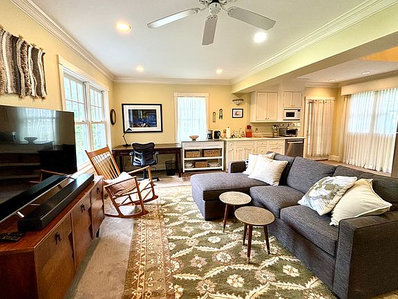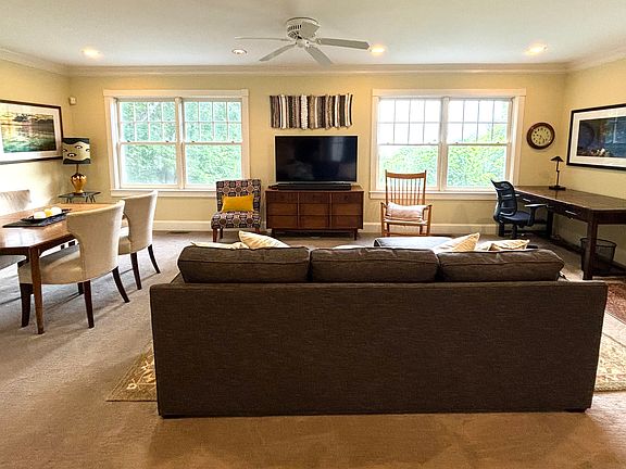 The Carriage house is a two bedroom, two bath house on a 9 acre estate. With beautiful views of Penobscot bay, a close proximity to downtown Camden (2 miles) and Camden hills state park with its extensive trail system (1/4 miles), it is perfect vacation spot. The house has ocean views from all rooms. Two bedrooms with queen sized beds, two en-suite bathrooms with showers are located on the second floor. The house comes fully furnished. Downstairs features a living room with a sofa and a 55" TV, a dining set, a desk and a kitchenette with a full size fridge, DW, two burner induction cooktop and a counter compact oven. AC window units in each bedroom and the main room downstairs in the summer months. The carriage house is attached to the main house by a breezeway but has a separate entrance with parking for two cars right in front. Available for a three month lease March to June - $3000 monthly, plus $1500 security deposit and a one time cleaning fee $250. All expenses are included in the the rent: heat, electricity, lawn mowing and snow and trash removal.