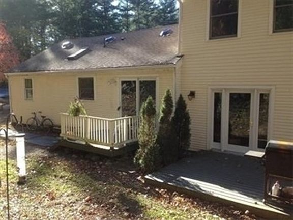 North Sudbury with lots of privacy! Less than 1000 ft from the town center. Property includes 2.84 acres abutting 58 acres of agricultural protected land. Colonial addition includes a cherry kitchen with granite counters, oak floors with cherry inlay renovated in 2012 and a walk in pantry. The living room with fireplace entertains a wet bar and leads to a large composite deck for easy entertaining and grilling. The master bedroom, closet and bath have radiant heat in the floors. The 2nd floor has an expansive room overlooking the woords and 2 additional BR's. The older section built in the 1600's of oak, post and beam construction is now a first floor in-law apartment, with two bedrooms and a fireplace in each the living room and the eat in kitchen. 2011 Upgrades include 200 Amp electrical underground, partial new roof, 2 new gas furnaces, new oil tank and solar panels for heating water.