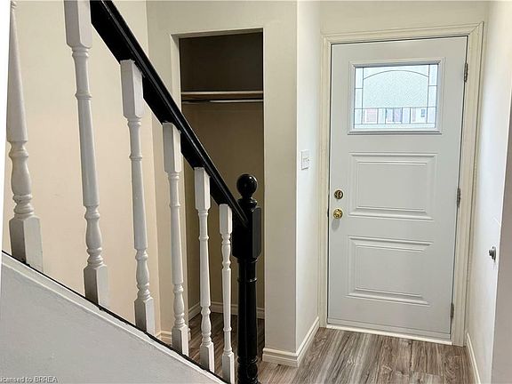 Beautiful 3 bedroom Brantford condo. This 2 storey townhouse style condo offers a ton of space for a budget savvy buyer. Main level boasts crisp white cupboards in the kitchen, spacious dining room and a living room with access to fenced yard. All new laminate flooring on the main level. The second level has 3 bedrooms with laminate flooring & 4pc bathroom with new vanity. Primary bedroom is large with ample closet space. Partially finished rec. room, 1pc bathroom ( vanity is not hooked up ) and a utility/laundry room downstairs. Electric baseboard heat. Close to the park, bus route, shopping and 403 highway. Immediate possession available. Roof 2014. Insulation R60 2013. Windows and exterior doors 2022. Security cameras on site monitored by the management company. Carpet free home for easy maintenance. Water heater is owned 2015. Fridge and stove included. One dedicated parking spot #7 and there is visitor parking in the lot as well. Quick commute to Hamilton and minutes from 403 Hwy.