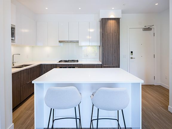 WELCOME TO SYNCHRO - Come home to a quiet north facing 2 bedroom 2 bathroom plus den home with a large outdoor patio! Beat the summer heat with air conditioning. Fully integrated SMART HOME with digital door lock and thermostat. This home features an efficient layout, high end laminate flooring, 9 foot ceilings, roller blinds, a custom kitchen island, California Closets and more. This impeccable kitchen features quartz countertops, a custom kitchen island, Blomberg & Fulgor SS appliances & hood fan. This home welcomes you w/ abundant light in each room as you are greeted w/unobstructed North Mountains and Expansive Vancouver Skyline Views. Seeing is believing: rental and pet friendly, 1 large parking stall and 1 secured storage.