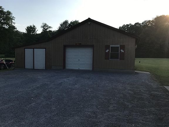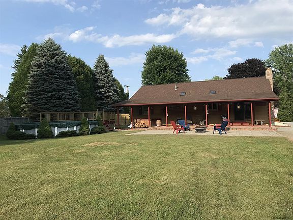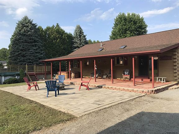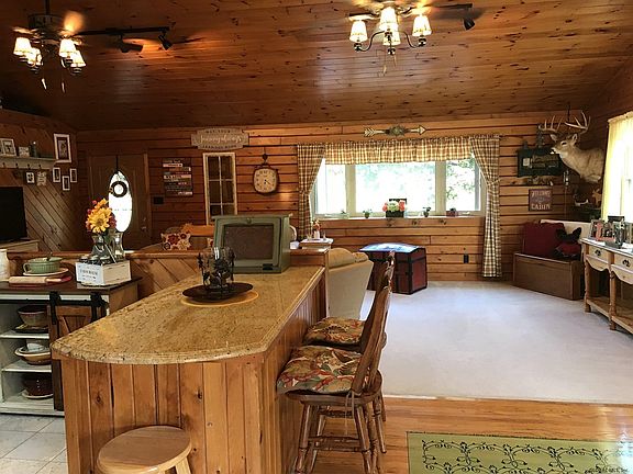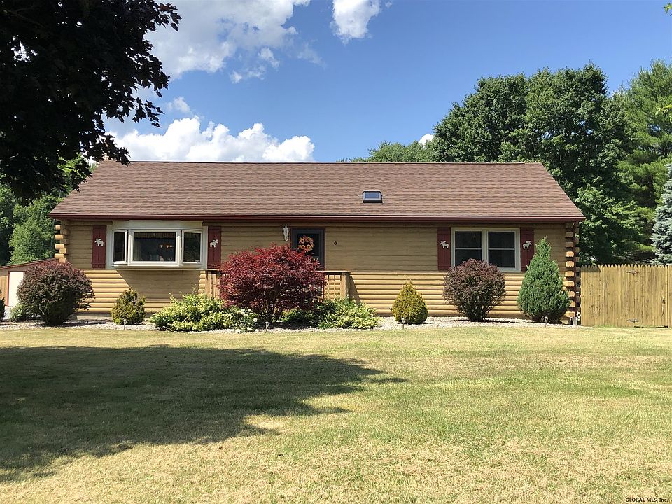 Cedar log ranch home on 1.88 acres. Open Concept w/ cathedral ceilings. Newer SS appliances and solid surface countertop. 2 bedrooms w/ large walk-in closets and 2 full baths. Full Basement with pellet stove and 2 additional rooms (family room , home office) and lots of storage.Step out the back door to the 2 tier patio with plenty of room for entertaining. Hot tub and above ground pool w/ deck included. Large flat backyard, nicely landscaped and huge stoned driveway/ parking area. 38x28 Detached garage w/ pellet stove / propane heat and additional work shop area. Windows, Roof ,septic and leach field have all been updated.