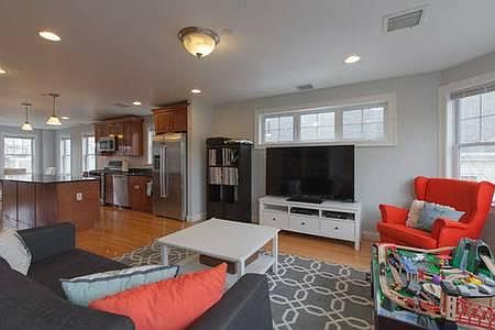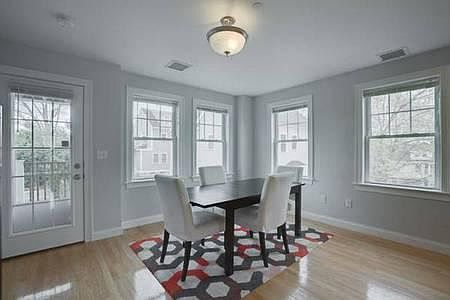 1st floor - Beautiful hardwood floors line an open and spacious living room, kitchen and dining room area, with ample storage space and granite kitchen countertops and island. Stainless steel Bosch kitchen appliances (dishwasher, range, microwave, refrigerator) included, purchased in late 2014. A washer-dryer room with Samsung washer-dryer units also included. Back entrance includes a patio space, perfect for a small potted garden or a BBQ pit and outdoor furniture. 2nd floor - Clean hardwood flooring spans 2 bedrooms and 1 spacious master bedroom that easily accommodates a king size bed. Included in the master suite is a large, 2-wardrobe closet with a bathroom and walkout deck with a nice view of Roslindale. A full bathroom along with two bedrooms are also on the 2nd floor, with both bedrooms providing clean IKEA storage shelving units. Laundry in Unit - Pet Friendly - Available parking Lot