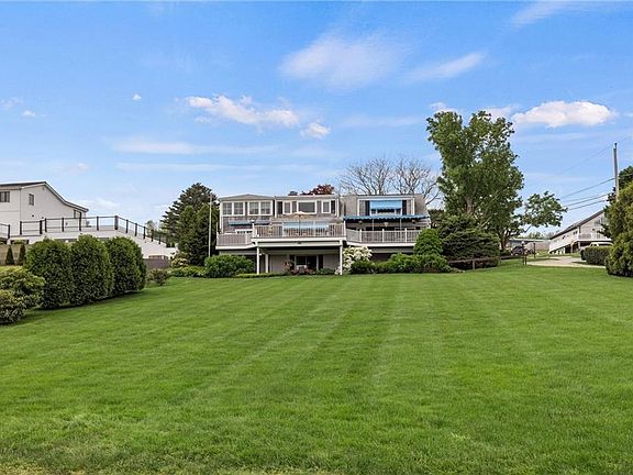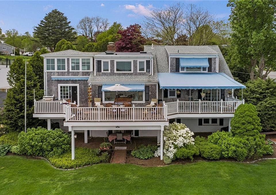 Located on a corner lot of the coastal McCorrie Point neighborhood, this custom home hits the ambiance button with beautiful gardens, a sweeping lawn, and panoramic views. As you enter the foyer, the grand living room greets you with beautiful water vistas. The remainder of the main level includes two ensuite bedrooms, an additional bath, laundry, a cozy media room with surround sound and pocket doors, an expansive chef’s kitchen that leads to the dining area, which opens to a gorgeous mahogany deck with a gourmet grill area, multiple sitting areas, and awnings for your enjoyment/ease of entertaining indoors and out. The second level consists of a spacious primary suite with stunning water views, two walk-in closets, and a large ensuite bathroom, plus two side-by-side offices with incredible water views and an additional half bath. The lower level provides a walkout in-law suite/guest/flex area with sliders to a lovely private brick patio and a fantastic wine room extraordinaire, perfect for the wine enthusiast. Additional features include 3 fireplaces, a 3-car garage equipped to charge an electric vehicle, woodworking shop area, central air, solar panels, and a whole-house generator. Less than a block from McCorrie Beach and centrally located in Portsmouth, this prime location also provides easy access to everyday conveniences and major routes to Boston, NY, and Newport. Seller to find suitable housing.