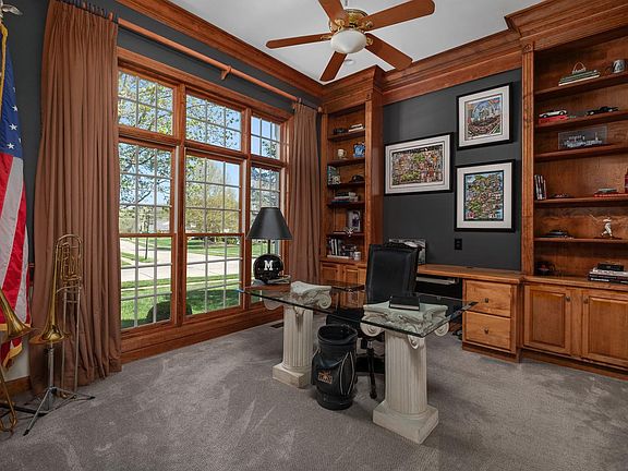 Experience Pine Creek elegance. Enter to a majestic flared staircase that leads to a grand foyer and a two-story great room boasting 18-foot ceilings, a warm gas fireplace, and a magnificent wall of floor-to-ceiling windows. The gourmet kitchen boasts granite countertops, a center island with a gas cooktop, updated stainless steel appliances, a double wall oven, and a planning desk. The adjoining vaulted hearth room exudes a warm and welcoming ambiance and boasts a gas fireplace. The elegant formal dining room is adorned with crown molding, and accompanied by a butler's pantry. A handsome office space awaits, equipped with custom-built cabinetry. The spacious main-level primary suite features walk-in closets, dual granite vanities, a Jacuzzi tub, and a water closet. The upper level boasts three bedrooms, each with walk-in closets and two full baths. The lower level features a family room with a cozy gas fireplace, full bar, hobby and exercise room, 3/4 bath, and wine cellar.