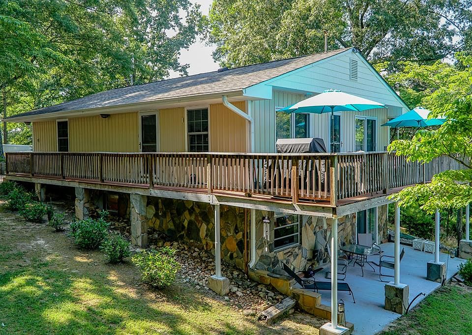 Lovely waterfront home in move in condition. This homes offers wonderful main level with open concept and lovely views out Jimmies Creek the moment you walk in the door. Updated kitchen in 2007 with new cabinetry, granite counters, stainless steel appliances and hardwood floors. All bathrooms were updated with tiled floors and new vanities. Large basement perfect for others to have their "own space." Wrap around porch and covered concrete patio offer great outdoor extended living space in which to enjoy the lake views. 18 x 20 Double carport with concrete floor perfect for parking or additional entertaining spot. 20 x 28 garage/boat shed and coveted storage space. Don't miss the recently updated outdoor shower/bath house. Excellent water - Water depth at day of listing was 7' at the end of the dock. All of this on Jimmies Creek with no bridge or culvert to navigate.
