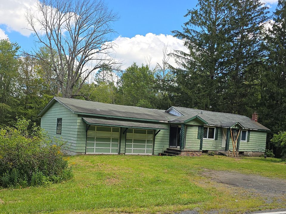 Set on just over half an acre, this single-level home features 2 bedrooms, an attached two-car garage, and a traditional layout with a spacious living area. The kitchen features warm wooden countertops, and a back porch overlooks the yard with stairs leading down to the open backyard for easy outdoor access.The basement provides additional space that can be used for storage, a workshop, or hobbies. Located close to Lake Wallenpaupack, Promised Land State Park, and main roadways, the property offers a peaceful setting with quick access to recreation and nearby amenities.