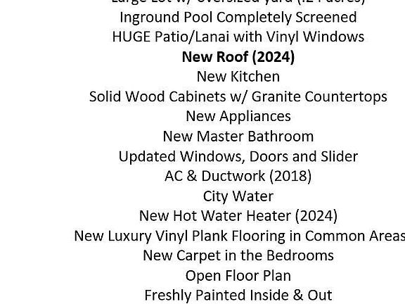 New Owner Wanted! Completely Remodeled POOL Home! 4 Bedrooms 2 Bathrooms! Large Lot w/ oversized yard (.24 acres)! Inground Pool Completely Screened! HUGE Patio/Lanai with Vinyl Windows! New Roof (2024)! New Kitchen! Solid Wood Cabinets w/ Granite Countertops! New Appliances! New Master Bathroom! Updated Windows, Doors and Slider! AC & Ductwork (2018)! City Water! New Hot Water Heater (2024)! New Luxury Vinyl Plank Flooring in Common Areas! New Carpet in the Bedrooms! Open Floor Plan! Freshly Painted Inside & Out! New Ceiling Fans & LED Lighting! Laundry Inside w/ Sink! Fenced-in Backyard! Pool / Storage Room! Second Rollup Garage Door to Additional Patio! New Outlets & Switches! Painted Garage Floor!