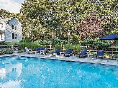Open to two week rental in July! Never rented before. Bask in secluded tranquility and chic indoor/outdoor living in this four-bedroom, four-and-a-half- bathroom Sag Harbor mid-century decorated, modern farmhouse. This bright, immaculate home was refreshed and newly furnished in 2021 to create a residence filled with light and easy fluid entertaining. The L-shaped structure highlights the stunning park-like grounds with six sets of French doors that open to the large patio and lush outdoors with wide open vistas. A bluestone patio overlooks rolling lawns, and the 47x18' heated, gunite pool is surrounded by towering mature trees, creating a beautiful view for al fresco dining and lounging. Inside, tall ceilings and wide-plank hardwood floors run throughout 4,200 square feet. On the main level, enjoy a corner large living room and a spacious library/den featuring a warm fireplace, TV, built-ins and window seats. The open kitchen is a cook's dream where custom cabinetry, poured bi-level concrete countertops and a farm sink are surrounded by premium appliances, including a Sub-Zero French door refrigerator, a Viking range/cooktop, and two Bosch dishwashers. It opens onto the dining area which features another fireplace. A gorgeous powder room and laundry room round out the bright and airy lower level. Ascend the custom open staircase to find 4 bedrooms, all ensuite. Guest bedrooms feature a Queen bed, one with two Twin beds, and another with a Twin daybed plus crib. A convenient office is also located on the upper level. The Master bedroom suite with King bed connects to the bathroom bathroom with chic tile, a frameless glass shower and double vessel sink vanity. The home's fully finished lower level offers a large open recreational and play space, with comfortable sectional, TV and Peloton. Surround sound runs throughout. The magnificent 4.6-acre lot is bordered by more than 100 acres of reserve forest land. There is a children's rope's course set up on the lawn as well. Located at the end of a long drive leading to only two other homes, this secluded home borders Sag Harbor Village and is conveniently located less than a 5 minute drive.