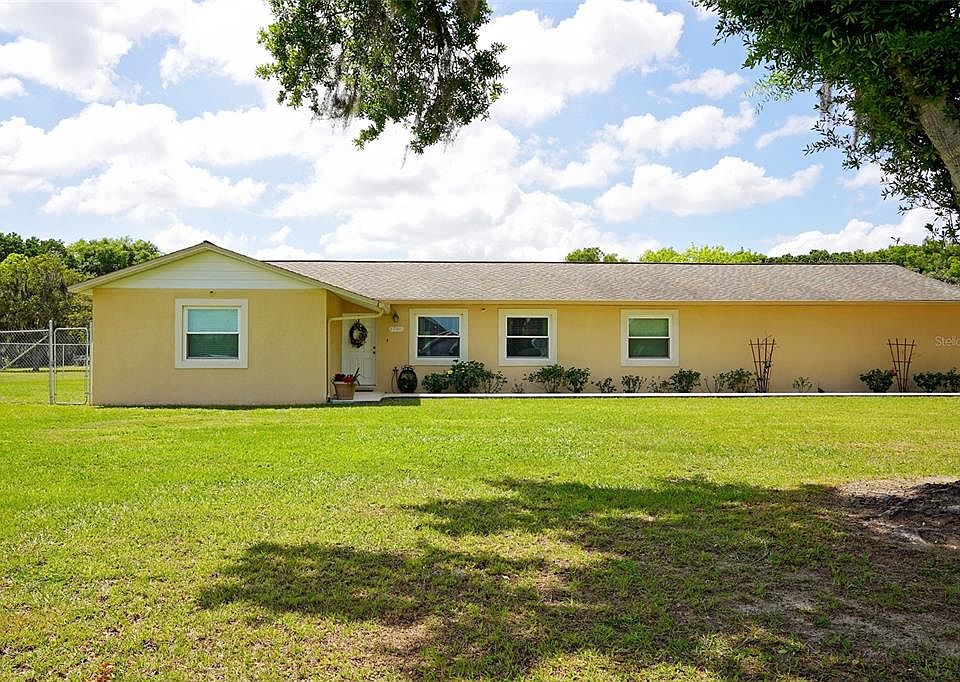 Slice of Country Paradise. Completely renovated 3 bedroom 2 bath home on 2.58 acres with versatile big Red Barn that offers perfect place to host all your gatherings for family and friends with plenty of space for guest parking and still room for all of your toys. His and Her Air-conditioned spacious detached restrooms. Main home updated, upgraded and renovated. (2016) Roof w/ 3D shingles, electric, plumbing, doors, windows, tile thru-out, water heater, kitchen and bathrooms. (2019) Stucco (2021) Water Tank Bladder (2022) Complete new HVAC install inside and out, water Pump, New 20x30 Metal Garage, Above Ground pool, screen porch with insulated roof and chain link fence. Event Barn built 2015 updated from wood siding to metal 2021. Meticulously maintained and impeccably renovated home with fully equipped kitchen with granite countertops, soft close cabinets and center island. French doors lead from the kitchen to the enclosed screened-in lanai that overlooks the above ground pool. Wood look tile thru-out, 5.25 baseboards. Primary bedroom with ensuite with dual sink vanity and tiled walk in shower with two shower heads (hand held combo and fixed rain head) 26 X 28 OVERSIZED 2 CAR GARAGE With extended extra long driveway. This property it the epitome of a peaceful residential oasis with enough room to celebrate life's special moments with the unique opportunity to embrace the American Dream. No HOA/CDD or Deed Restrictions. On Well and Septic.