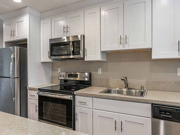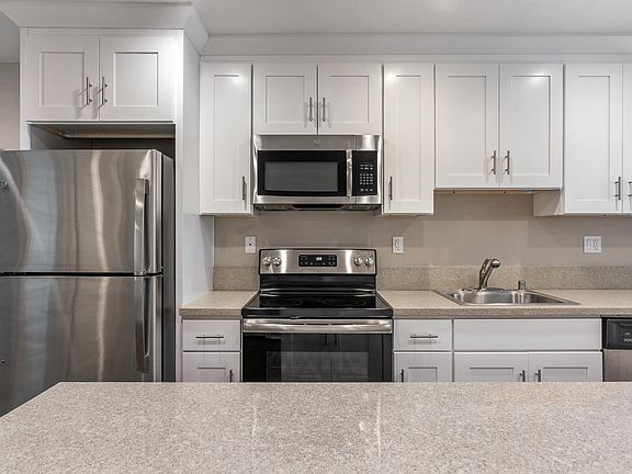 Fully Equipped Kitchens Stainless-Steel Appliances White Shaker Panel Cabinetry and Brushed Nickel Hardware Dishwasher Kitchen Island Plush Carpeting and Wood-Style Flooring Ceiling Fans Ample Storage Private Patio or Balcony Furnished Homes Available via CORT Furniture*