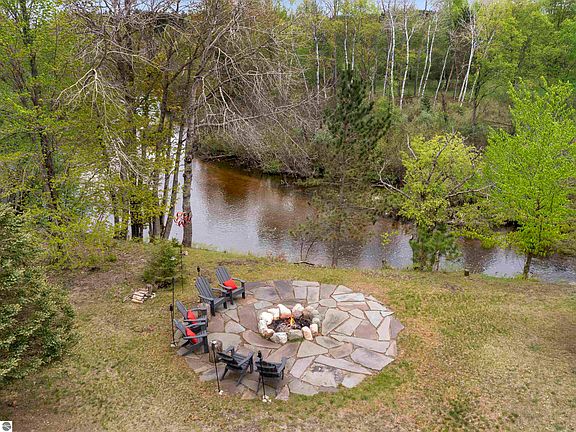 Experience the peace and serenity of life on the Betsie River in this artfully crafted, custom log-sided home. Thoughtfully renovated and meticulously maintained, this 4-bedroom retreat blends timeless craftsmanship with quality finishes including granite countertops, tile and hardwood floors, and expansive windows that bring the river and surrounding landscape right into your living space. Set on nearly 5 acres with approximately 1,400 feet of private frontage on one of the most sought-after stretches of the Betsie River, this property offers unmatched access to some of the region’s best salmon, steelhead, and trout fishing. Launch your canoe or kayak from your own yard and spend the day winding through pristine waters, protected under the Natural Rivers Act to preserve privacy and natural beauty. The oversized garage provides plenty of room for all your up-north gear and toys. And while the setting feels completely secluded, you're just minutes from Lake Michigan, Sleeping Bear Dunes, and Crystal Mountain — offering four-season recreation including swimming, boating, tubing, skiing, and more. Lovingly cared for and never used as a rental, this home offers a rare opportunity to own a riverfront sanctuary that embodies the essence of Pure Michigan. If you value craftsmanship, privacy, and connection to nature, this is a must-see.