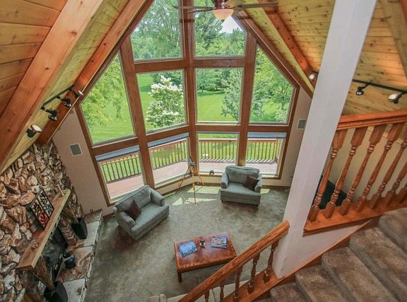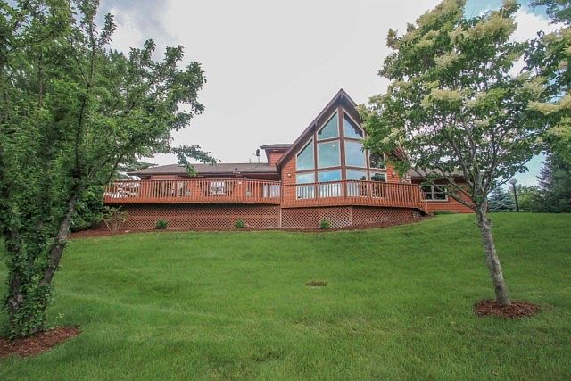 This private 22 acre retreat is truly a one of a kind perfect for hunters, nature lovers & relaxation! Features magnificent panoramic view of paradise through large picture windows, wraparound deck, solid 6 panel doors, skylights & fully finished rec room. Property includes 2 ponds, long private driveway & year round wildlife. Recent updates to kitchen w/ granite counters, furnace, a/c, water softener & many windows. Extra 3.5 car garage w/ 220 & newer epoxy floors. Owner may assist in financing.