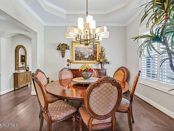 the orientation of three strategically placed solar tubes and custom lighting throughout. The large living area with gas log fireplace is flanked by custom built-ins. The coffered ceilings contribute to the elegance of the room, yet the openness maintains a casual, easy living style. To the right of the foyer is a formal dining area which leads to the gourmet kitchen complete with quartz countertops, full tile backsplash, a massive island, RO system, gas cooktop, double