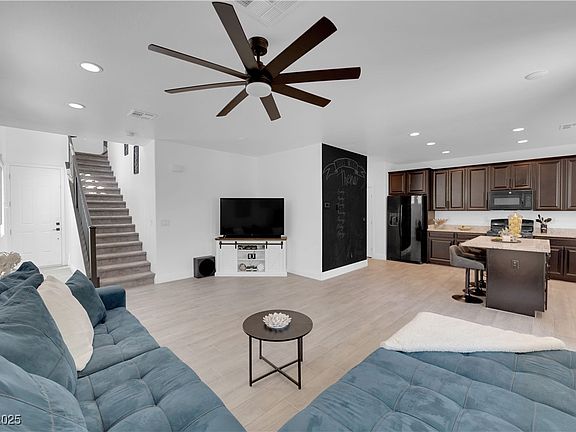 Welcome to your dream home in the heart of North Las Vegas! This stunning two-story residence offers 3 spacious bedrooms, 3 bathrooms, and an open-concept design perfect for modern living. The expansive living area seamlessly connects to a chef’s kitchen featuring granite countertops, a large island, dark cherry cabinets and black appliances. The primary suite has a spa-like ensuite with dual sinks, a soaking tub, and a walk-in closet. Enjoy low-maintenance outdoor living in the landscaped backyard with a covered patio—ideal for entertaining or relaxing year-round. Situated in a peaceful community, this home is conveniently close to shopping, dining, and schools. With a two-car garage, upgraded flooring, and freshly painted interiors, this move-in-ready gem is the perfect place to call home.