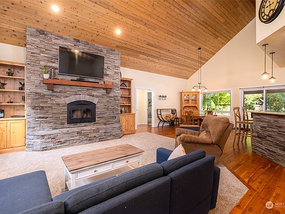 Paradise in Birdsview! This well maintained single-level home on a 1-acre lot offers 2,762 sq ft of living space with 3 bedrooms, 2 full baths, and 2 half baths. A grand entryway with vaulted cedar ceiling, you will be drawn to the wood-burning floor-to-ceiling stone fireplace that adds a touch of rustic elegance. The open-concept kitchen features granite countertops, alder cupboards, walk-in pantry, and SS appliances. Hardwood floors flow throughout, with new carpet in the bedrooms and living space. In addition to the generous living area, this home offers an additional office/hobby room, providing versatility for your needs. Covered back patio, a 2-car garage, & a detached 24x24 shop/garage. All nestled in a serene riverfront community!