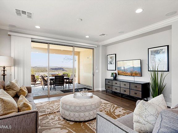 From the moment you enter the home you are drawn to the expansive views and stunning wood look tile. Kitchen features Quartz Counters, electric cooktop, wall oven and Subway tile backsplash. This floor plan has 2 Ensuite bedrooms with custom tiled showers and dual sinks. Great room has 15' sliding glass doors, surround sound and crown molding. Dining features sliding glass door that leads you to a side patio. Back Covered patio with extended pavers leading to your firepit. Sit back with your favorite beverage and enjoy the expansive mountain views.