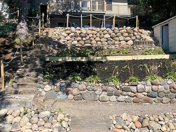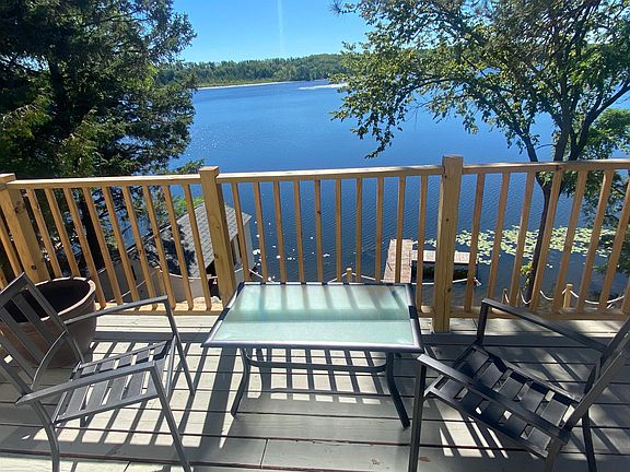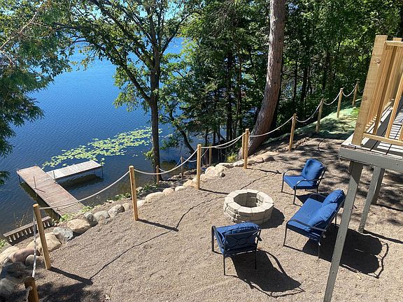 Beautiful view of the lake on almost an acre! Newly Landscaped with new retaining wall, pea rock, fire pit, seeded grass, remodeled stairs, and clean shoreline for great swimming. Great VRBO, cabin or homestead with access to Sibley Lake. Inside is fully remodeled! Expanded the kitchen, butcher block countertops, and added an island with bar seating. New septic system, siding, electrical, plumbing, windows, doors, deck railing, carpet, and much more! New roof on the boat house and second building. The second building has power with the potential to be additional sleeping space or game room. Included is the dock and metal car port to park an RV or boat.