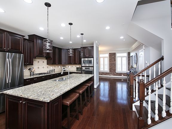 This four bedroom, four and a half bath end unit smart home features including; 9 foot ceilings, beautiful hardwood floors, a large open kitchen with 42" cabinets, granite tops, tile backsplash and SS appliances, a gas fireplace in the Living Room and a formal Dining Room on the first floor. Upstairs, the primary bedroom has an en-suite bath with dual showerheads, tray ceiling, walk-in closet and two additional bedrooms share the hall bath. Laundry is conveniently located on the second floor. The third floor features a large fourth bedroom (loft style) with en-suite bath, walk-in closet and a balcony. The finished basement has an office (possible 5th bedroom), separated from the rest of the basement by French doors, a full bath and a large home theatre room with a 13' screen, wet bar, beautiful cabinetry, and wine fridge. This home also offers a two car detached garage, expanded private deck and has multiple cameras for security. Owner pays Heater Maintenance, Association dues such as Trash, Common Area Maintenance, Grass and Shrubbery Maintenance and Snow Removal. Tenant is responsible for Water, Sewer, Cable and Heating.