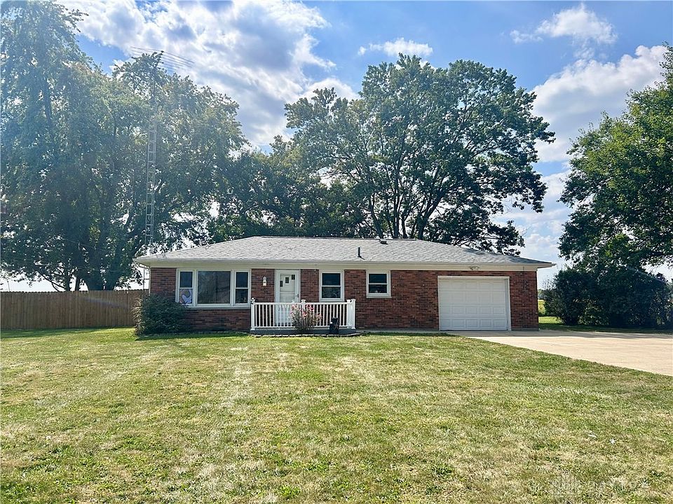This cute brick ranch home is located on a triangular lot with a completely fenced-in backyard. As soon as you pull up, you will notice the concrete driveway with plenty of space for parking & a turn around for convenience. The roof was replaced approx. 3 years ago. Gutters and downspouts 2016. Once inside you will find neutral flooring in the living room, a coat closet, & a built-in storage cabinet. The kitchen has had some cosmetic updates (approx. 3 years ago) with gray flooring, tile backsplash, sink, countertops and appliances. The water heater was replaced in 2022 as well. The home has electric radiant heat in the attic. Down the hall is the 2 bedrooms with neutral carpet. Laundry hookup with cabinets for added storage. No A/C unit but the home does have a permanent wall unit in the living room & 2 window units in each of the bedrooms. Water softener located in the 1.5 car garage. The sidewalk on the north side of the house leads to a gate to the backyard. Enjoy sitting out under the covered patio. Firewood conveys to start a bonfire. Plenty of backyard space to add a shed. Easy access to Dayton or Greenville.