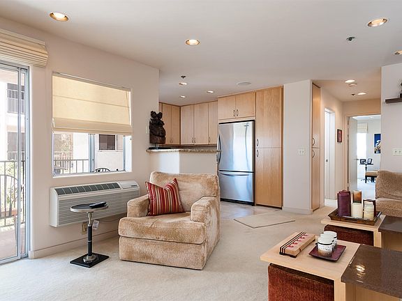 Beautifully updated Pacific Ridge Two Bedroom! Spacious living room with custom built in entertainment center, recessed lighting on dimmers, large patio (one of two). Kitchen features granite slab counters, custom cabinetry, stainless steel appliances and Travertine flooring. Large Master Bedroom has a walk in closet with built in organizers and a nice sized patio. Both baths have been updated with Travertine flooring and Granite topped vanities. Lots of recessed lighting, custom window coverings,