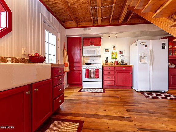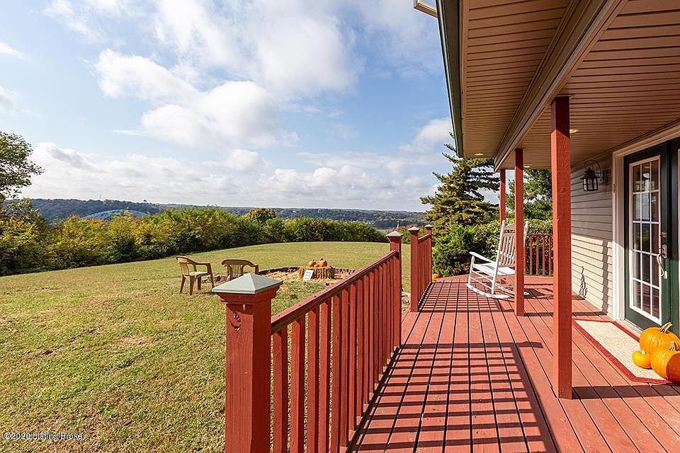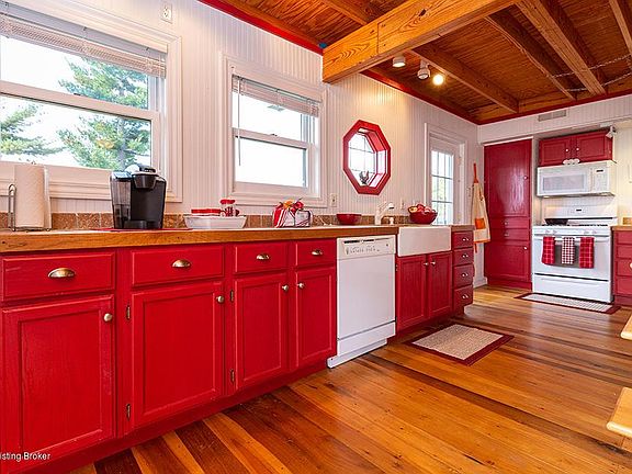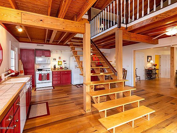 A magical getaway to be sure. This Perry County home sits atop a hill with a gorgeous view of the Ohio River, a pretty bridge and a lovely, gold church steeple. Sunsets are magnificent and at night the lights of Hawesville twinkle at a sky full of stars. ''Old Red Barn Place'' can be your staycation home away from home, a short-term rental, a remote office, or your own personal home away from it all. There's a view from almost every window looking out on a 4-acre parcel with no neighbors in sight. Designed as a contemporary farmhouse, the light wood floors contrast nicely with the tongue and groove ceilings, bright white bead board accents, and a fabulous red farm kitchen. The massive owner's bedroom was previously two identical bedrooms that can be easily restored with both having a