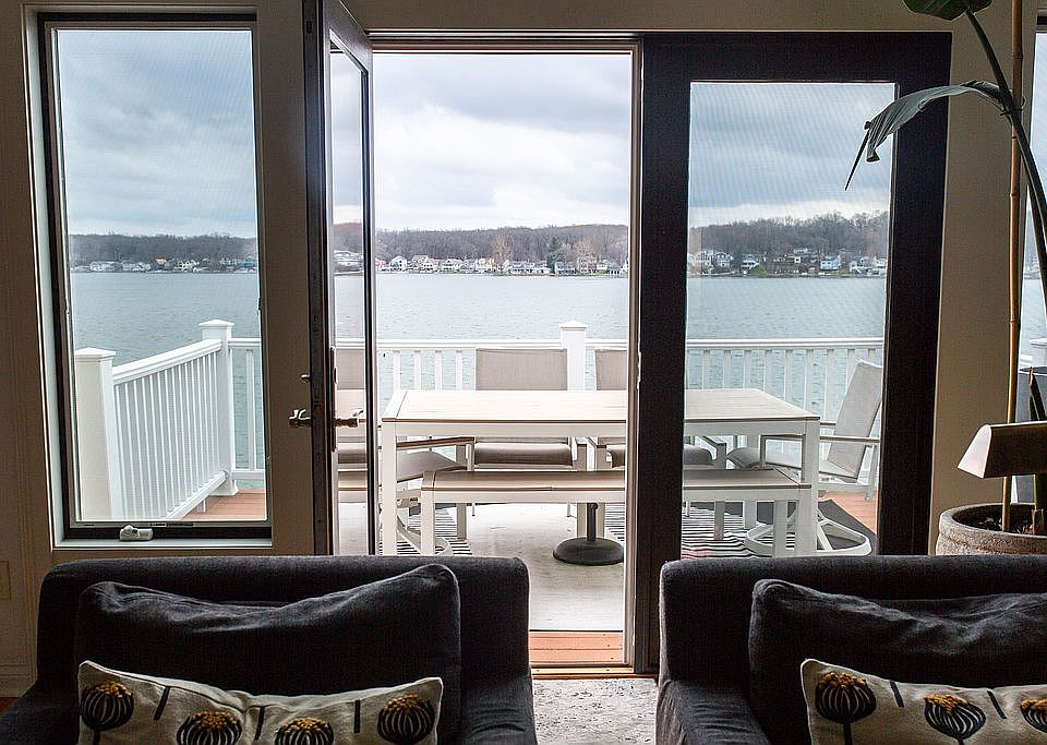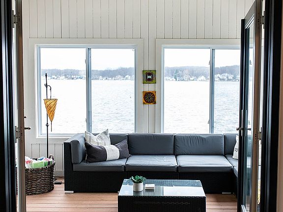 Experience breathtaking views on the 2nd basin of Crooked Lake. This modern home was designed and remodeled in 2019. It features luxury upgrades with Thermador appliances and has beautiful Calacatta gold quartz countertops with a waterfall island. Hardwood floors throughout the main floor. The lower level has a large living space with an extra kitchen, 2 additional bedrooms, full bath, workout room, storm shelter and a Florida room. The property has a firm swimming area, concrete seawall, included vinyl dock system, breath taking views from expansive windows, and a lakeside composite deck and slate patio with firepit perfect for entertaining. The back lot has a garage and plenty of extra parking for guest. The landscape was updated in 2023. The 3rd lower level has a large storage room for all your lake toys, furniture and fits the dock with plenty of room to spare. Crooked Lake is an 800+ acre all-sports lake offering endless fishing, boating and relaxation.