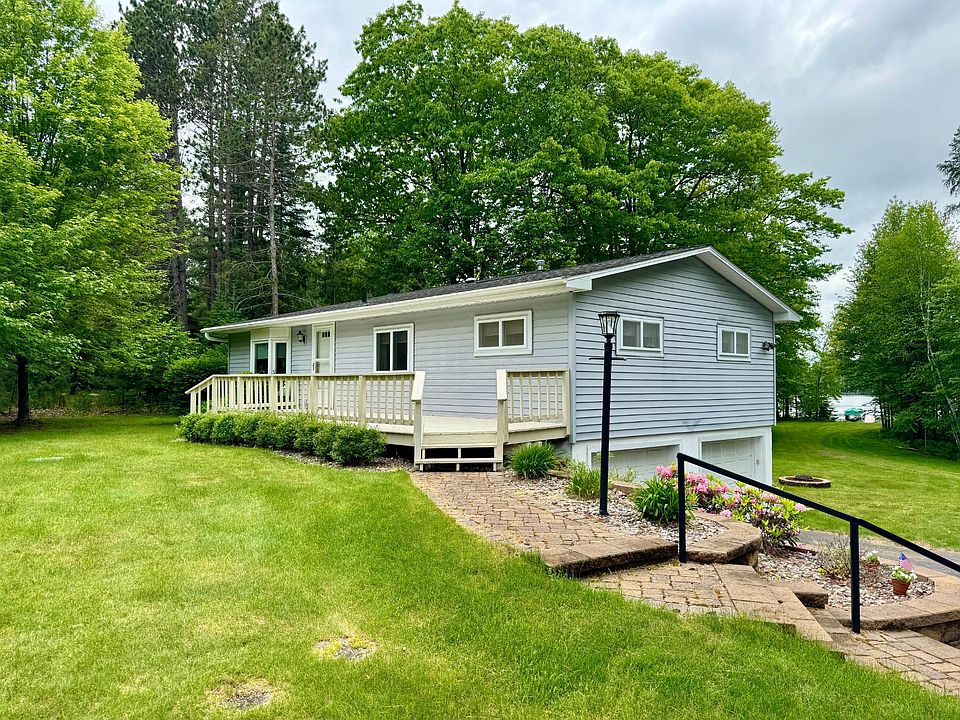 Lovely walk-out ranch on the Moen Chain of 5 lakes located east of Rhinelander. This 3 bedroom, 2 bath home is very well kept. The home features a fabulous lakeside great room with great views. It even has a pass-through to the kitchen! It has a large living room and dining area which opens to the kitchen. There are two bedrooms and a bath on the main level. In the lower level, there is another bath, family room with a wet bar and tons of closets. Outside there is a 90' long new aluminum roll-in pier, dry boat house, 3 decks, The elevation is nice and gentle and there is a sand beach on Moen Lake. The home is less than 5 miles to town too.