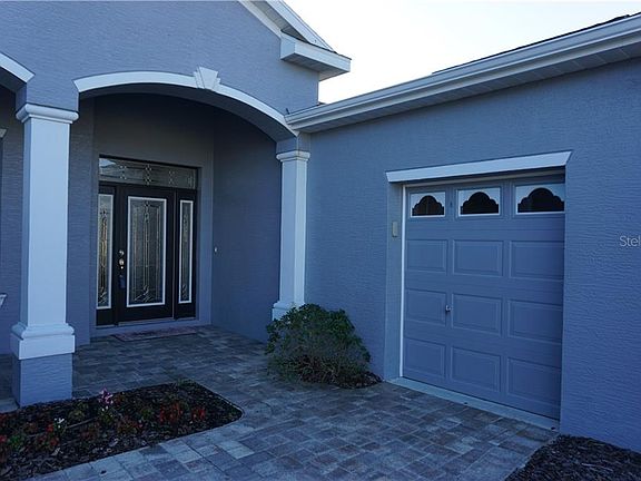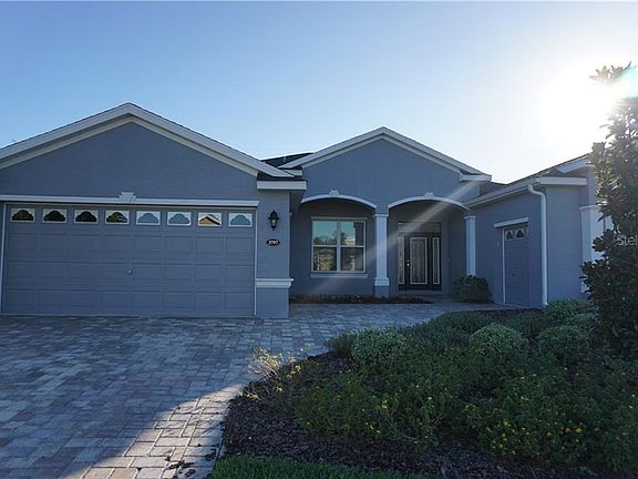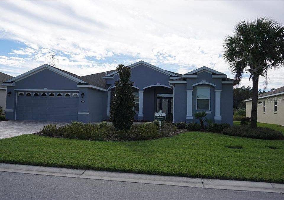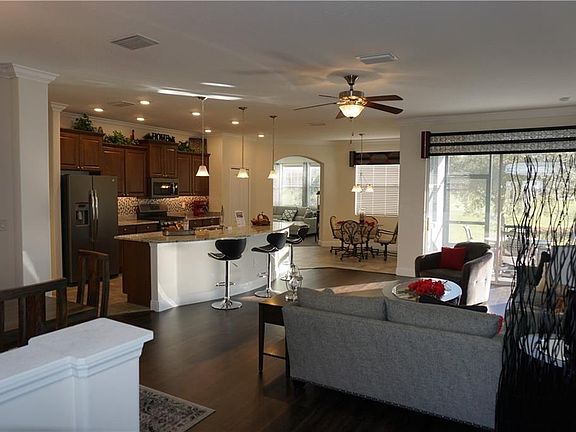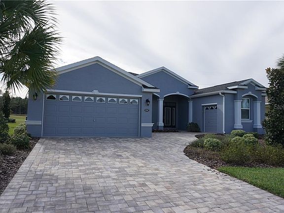 Very nicely presented Vanda II that is the model home for the builder so rest assured that this home features plenty of choice upgrades and selections. The home is located on the 13th fairway with views across the golf course. Inside you will find a beautiful kitchen with 36" upper cabinets, a full compliment of Slate finish stainless steel appliances including a 5 burner gas range, a center island with an 'eyebrow' granite countertop, designer backsplash, LED under cabinet lighting, LVT flooring replaces the carpet in the main living area, crown molding in the main living area & kitchen and deeper baseboard throughout the whole house. The master suite occupies the whole right side of the house and features a large walk in shower, quartz countertops and a very generously sized walk in closet. The split plan layout puts the guest bedrooms on the opposite side of the house. Energy saving features include a 16 seer HVAC unit with WiFi compatible thermostat, tailored foam insulation in the block walls, radiant barrier insulation in the attic with R38 blown in insulation, double pane windows with Low E glass. The main garage has been extended length wise by 2ft and there is also a separate golf cart/motorcycle garage. If that wasn't enough this "Where to Retire" magazine award winning community offers a 24/7 manned gated entry, 18 hole championship golf course, restaurant, pub, coffee shop, movie theater, fitness studio, heated pools, hot tub and much more. Grocery stores, pharmacy, restaurants and banking are just half a mile North of the community. Orlando airport and the attractions are all within one hour away and you can be on either the West or East beaches in one and a half hours. Come and take a look for yourselves after you have clicked on 'Tab 1' for the virtual tour and you never know this could just be your new house!