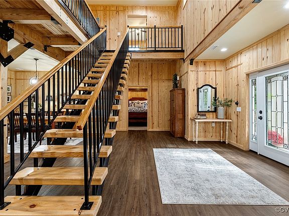 Enjoy country living at its finest with all the best modern conveniences! This stunning custom-built home was designed and built by the owner, and the care and thoughtful design shows in every room of the house. Upon entering through the barn-style doors to the front door, you are welcomed into the spacious foyer with a dramatic staircase centered in the room. The open concept family room, dining area, and kitchen are perfect for entertaining and relaxing. There is raw tongue and groove pine wood and picture moldings throughout. This, along with the hand cut granite gas fireplace give the entire home a warm and cozy feeling. The kitchen is spacious with all maple cabinets, soft close drawers, granite countertops, and Kitchen Aid appliances. The large 1st floor primary bedroom has a cedar walk-in closet and the primary bathroom has a double-vanity, tiled walk-in shower, and is plumbed for a soaking tub if desired. Upstairs, you’ll find two secondary bedrooms with another spacious tub/shower bathroom. The laundry room has a raised washer and dryer for ease of use and a sink for washing up. The oversized garage has exposed aggregate in the “parking areas”. Whatever your hobbies may be, the large detached 28’ X 48’ workshop is perfect! The workshop is divided into one unfinished space and one climate-controlled finished space boasting a built-in speaker system and its own half-bath. The workshop building also has a 30-amp motor home hook-up available.