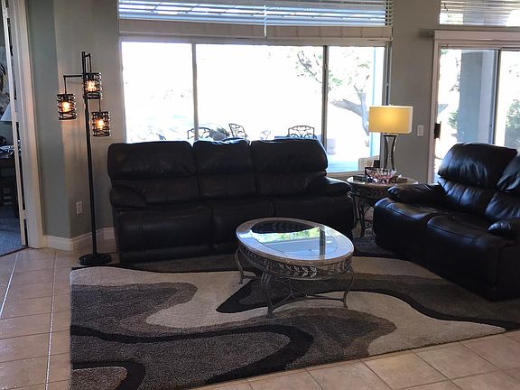 SUN CITY PALM DESERT. Home on the golf course, over looking 17th green. Furnished. Long-term rental. Looking for minimum 1 yr lease. Beautiful open floor plan. Recently upgraded with new appliances. King-sized bed in primary suite w/ dual sinks, walk-in shower, large soaking tub and huge walk-in closet. Guest room is an en-suite w/ king sized bed. Den has a queen sized Murphy bed for extra company. Tile flooring throughout except in bedrooms. 82" flat screen TV in living room. Electric fireplace credenza. Extra large patio with Aluma-wood cover. Amazing views of green, fairways and mountains. Beautiful large, private courtyard. Mature fruit trees. Property located in Sun City Palm Desert- a 55 and over community, which includes all amenities. Landlord pays water, trash, gardener and HOA fee, which includes cable, DVR boxes, internet, pest control. Tenant pays for gas and electric. What a deal! $3750 per month. Cleaning and security deposit required. No pets. No smoking. Landlord pays for water, trash, gardener and HOA fee, which includes cable, internet, pest control. Tenant pays for gas and electric. No smoking.